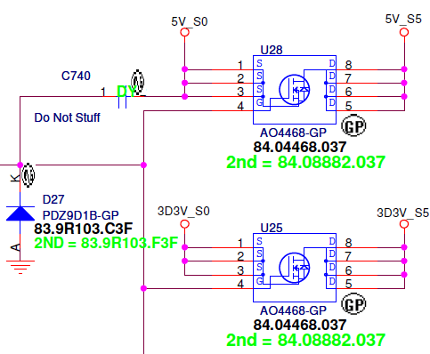 We need a supply voltage for the whole thing which we can find at the pins of U28, located on the front of the mainboard at the lower left. That chip is a switch to toggle the USB ports at the left side of the laptop on and off.