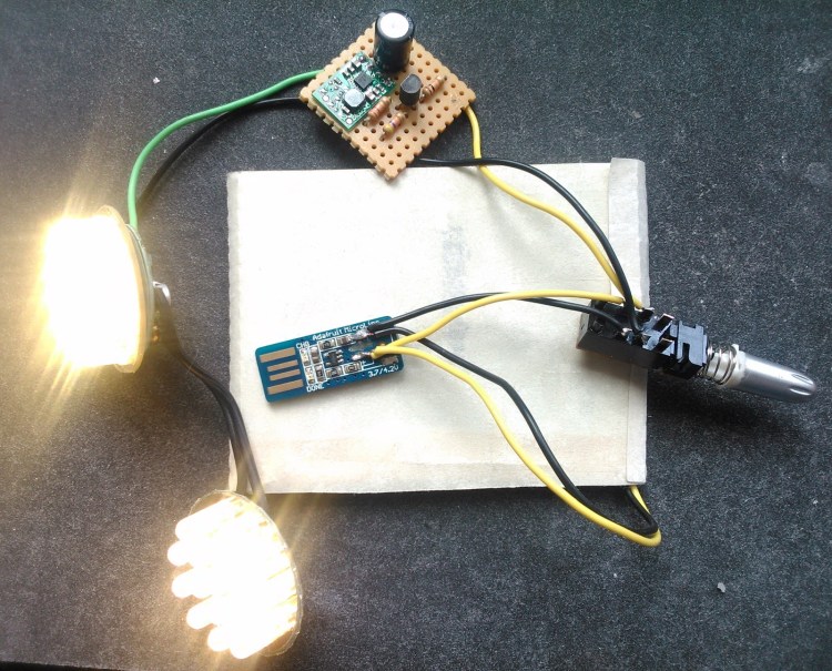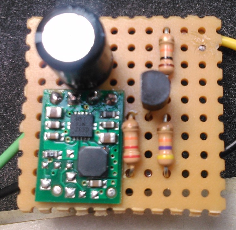 UPDATE: You can simply connect the battery to the lamp input! No step-up regulator needed! This makes the runtime even longer! The lamp will grow dimmer when the Li-Ion voltage drops and I’ve not seen it go below ~3.2V.